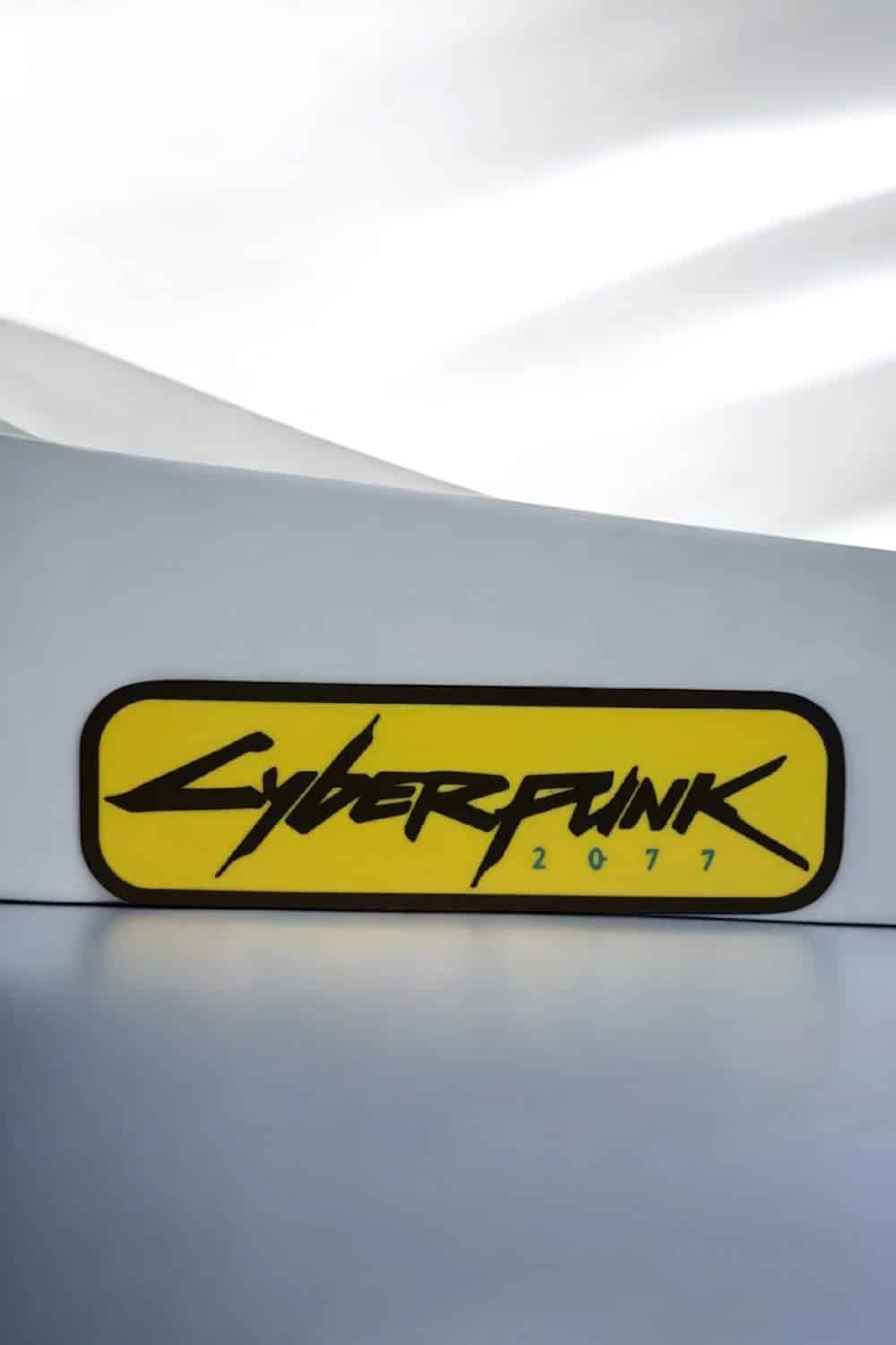 Le célèbre logo Cyberpunk 2077 est reproduit en 3D avec ses lignes tranchantes et sa typographie futuriste.